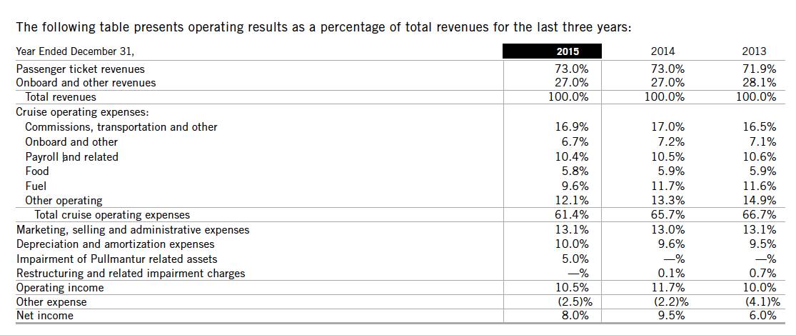 2013-2015年三年为例子,RCL的船票业务收入占总收入的百分比为:72%、73%、73%