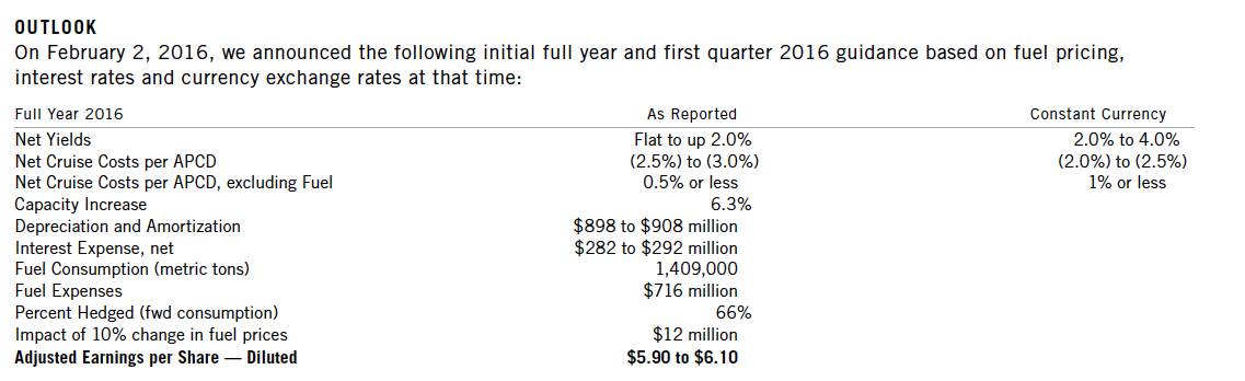 RCL最近发布的2016 Q2财报显示,公司业绩强劲,每股盈利突破预期,预期每股盈利$1.01, 实际每股盈利$1.09。但由于受到寨卡病毒、英国退欧以及恐怖事件频发、以及中国业务稍微放缓的影响,RCL发布了业绩预警,2016年全年的EPS削减为$6.0-6.1,相对比之前的业绩预期为$6.15-6.35。