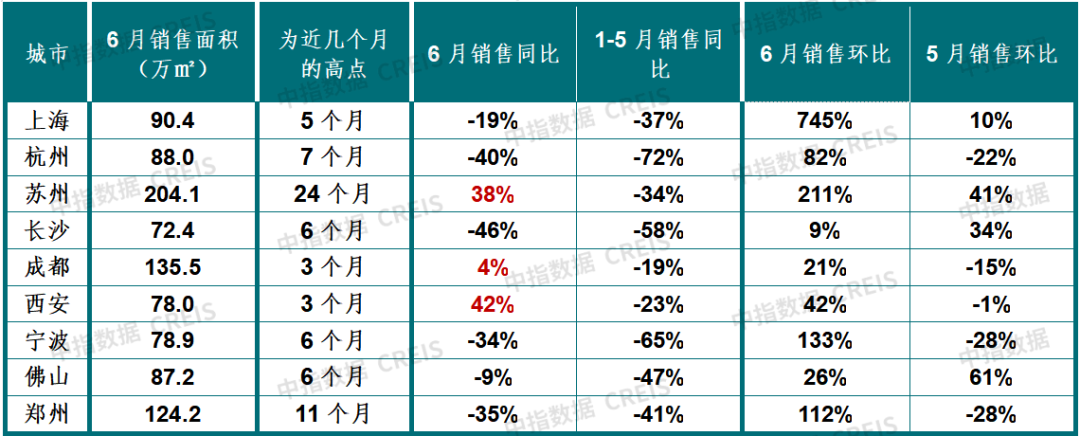 表:部分典型城市6月商品住宅销售面积及同比环比