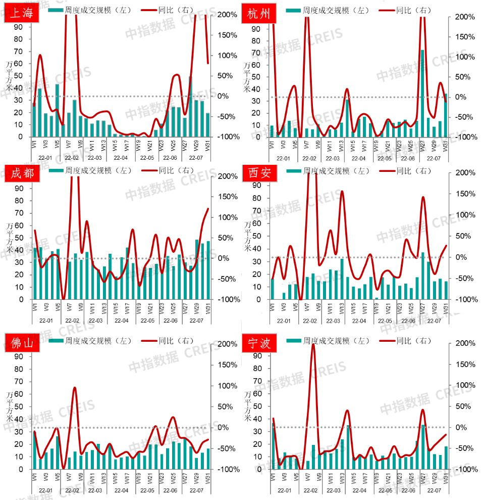 成都:5月政策出台后,商品住宅成交规模有所好转,6月市场情绪继续恢复叠加供给端改善,全月商品住宅成交面积环比增长超20%,同比亦由降转增。7月以来,疫情反复对市场带来一定扰动,商品住宅周度成交规模波动上行,月度成交规模环比有所下滑。成都二手房市场活跃度提升明显,6月成交1.67万套后,7月继续提升至1.7万套以上,市场情绪整体保持较高水平。
