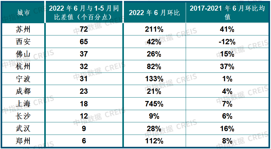 表:2017-2021年6月典型城市销售面积环比均值与2022年6月环比对比