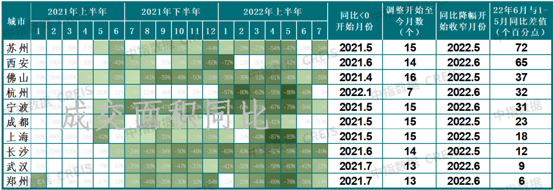 我们将各城市2021-2022年月度成交面积同比下降的月份进行了梳理,颜色越深表示同比降幅越大,意味着市场成交规模下降程度越深。可以看出,各城市房地产销售市场进入调整阶段的时间愈晚,企稳时间也普遍延后。部分在去年4、5月进入调整期的城市,如苏州、成都、上海今年6月销售同比已明显好转,其中成都、上海7月同比均为增长。