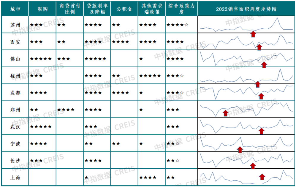 表:部分典型城市政策力度及2022年销售面积周度走势