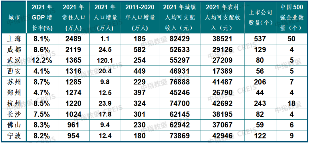 房地产市场发展趋势受城市基本面影响,当地的经济实力、人口规模及增量、居民收入等多方面因素决定了房地产市场的韧性。从数据来看,成都、杭州、西安保持较强人口吸引力,2021年人口增量超过20万人(武汉人口增加超120万人,主因疫情后人口回流);上海、苏州、杭州及宁波等长三角城市居民人均收入较高,2021年城镇人均可支配收入高于7万元,其中苏州、杭州和宁波农村人均可支配收入超4万元,居民收入水平处全国前列。杭州、苏州、成都及宁波上市公司数量超100家,上海超500家,经济实力突出。