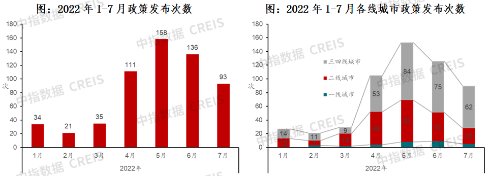 各城市积极落实“因城施策”,2022年1-7月全国有超210个省市放松了房地产调控政策,需求端政策不断发力,政策出台频次近600次。其中7月,地方政府政策出台频次有所放缓,整体以三四线政策调控为主,更多城市进一步出台相关措施,稳定当地房地产市场。