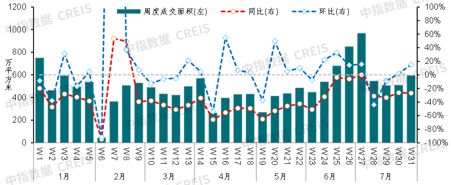 周度数据上来看,5月至7月初重点50城商品住宅成交面积整体呈回升态势,同比降幅逐渐收窄,政策效果有所显现。但受“断供”事件、前期积压需求集中释放后需求入市节奏回归等因素影响,7月市场活跃度有所下降,第28周成交面积环比降幅明显,近几周成交面积保持相对稳定,整体接近今年3月周度水平,同比降幅保持在30%左右,市场企稳恢复态势仍不稳固。