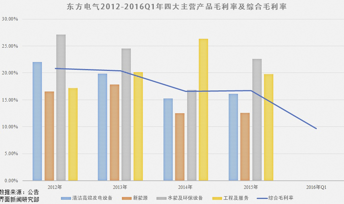 东方电气在2008年完成产业结构布局后,其主营产品则分为四类,分别为清洁高效发电设备、新能源、水能及环保设备、工程及服务。其中,业务占比最高的为清洁高效发电设备,该业务2015年的营业收入为230.32亿元,占总营业收入的63.95%。上述四类产品2015年的毛利率分别为16.12%、12.59%、22.57%、19.78%,整体综合毛利率为16.71%。