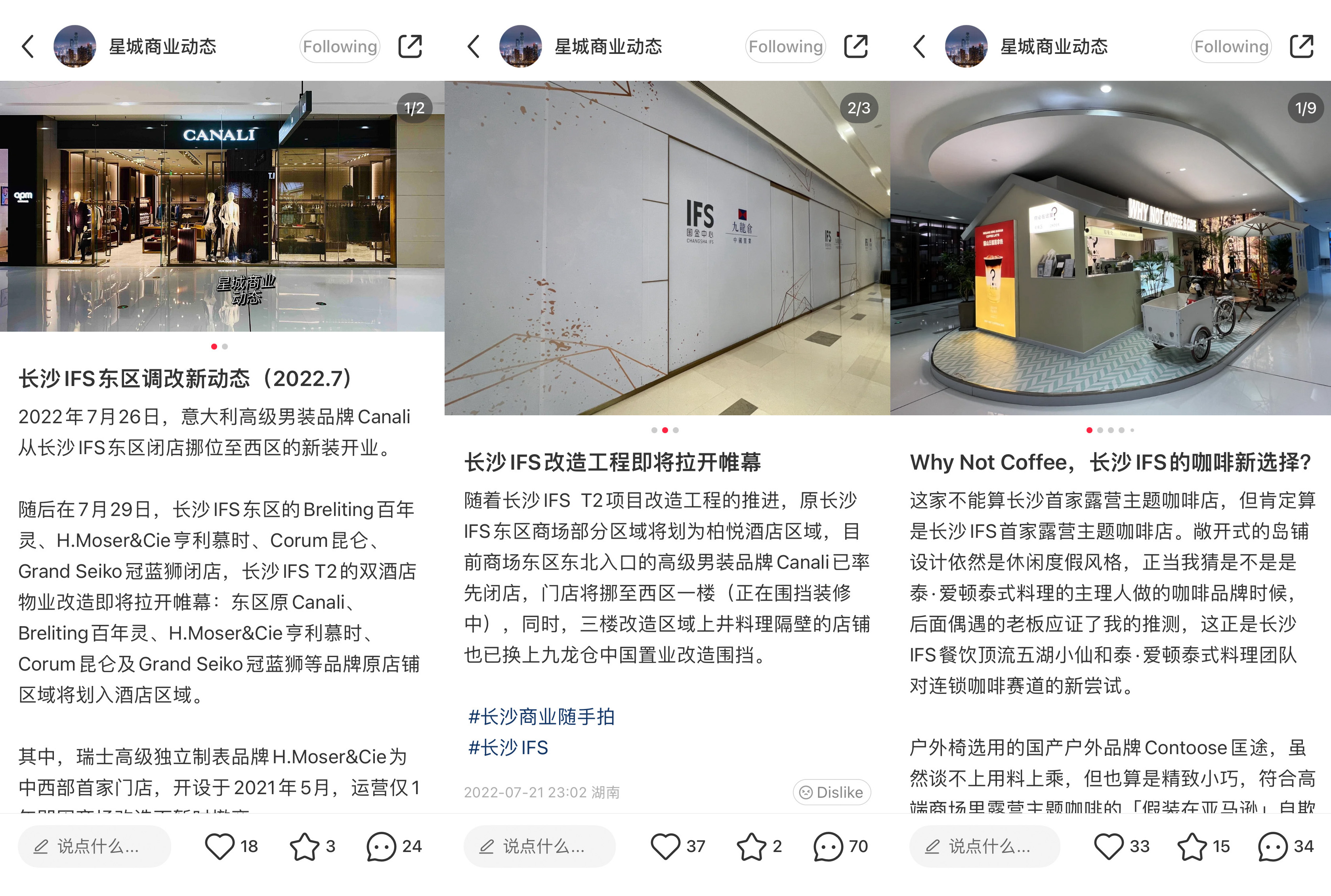 “大家都会认为城市商业丰富度以及亮点,是靠这些中高端品牌来撑起来的。” 老白说道。“老白”在小红书上运营着账号“星城商业动态”,聚焦长沙的商业动态。