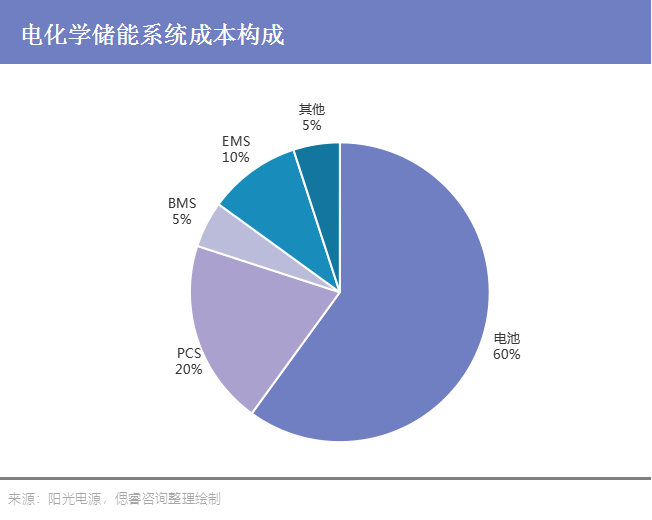 从储能系统成本构成上看,电池成本占比最高,达60%。因此,储能系统成本下降的关键是电池环节的降本增效。