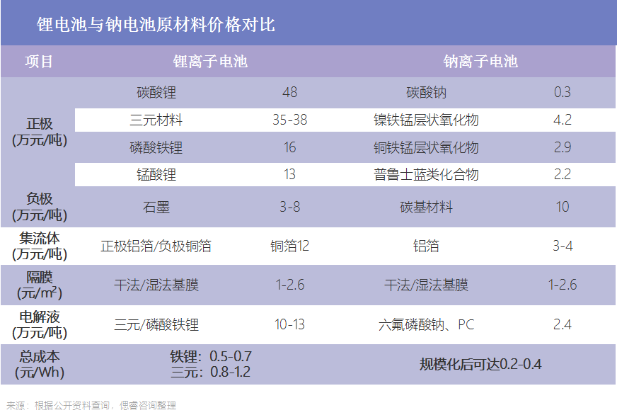 综合正负极、集流体、隔膜、电解液等原材料,锂电池(铁锂方案)的综合成本介于0.5-0.7元/Wh,而钠离子电池的综合成本则有望达到0.2-0.4元/Wh。