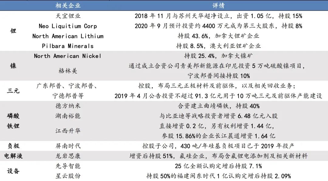 从供给侧看,宁德时代虽为电池制造商,但近年来其业务布局早已不止电池制造那么简单。据统计,早在2020年,宁德时代的触角早已伸向囊括原材料矿产、电池材料、电池应用、终端产品运营的全产业链业务,布局方式包括投资参股、收购、成立子公司等。
