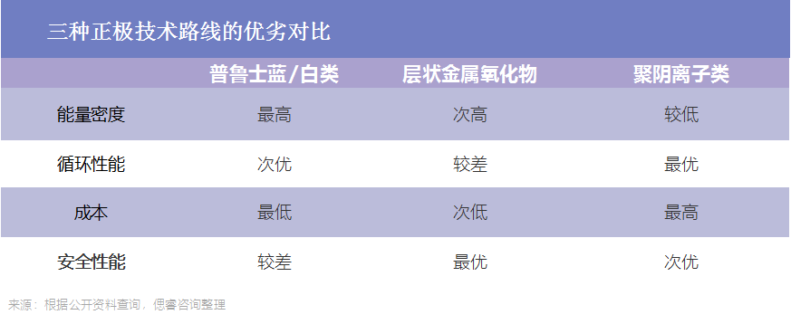 正极材料是影响电池能量密度、循环寿命等性能的决定因素。在目前行业中共有三种技术路线:过渡金属氧化物(中科海钠、钠创新能源路线)、普鲁士蓝类化合物(宁德时代路线)和聚阴离子型化合物(众钠能源路线)。