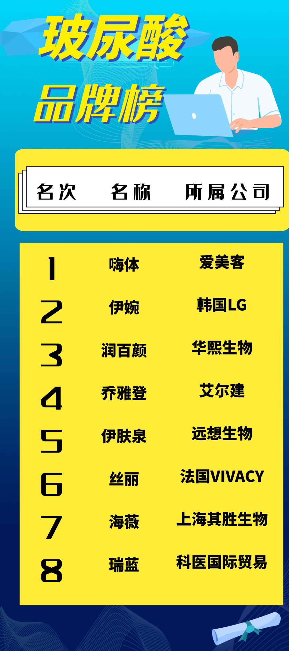 在目前可知的玻尿酸品牌中,排行第一的是爱美客旗下品牌“嗨体”,紧随其后的是韩国LG旗下的“伊婉”与华熙生物旗下的“润百颜”。