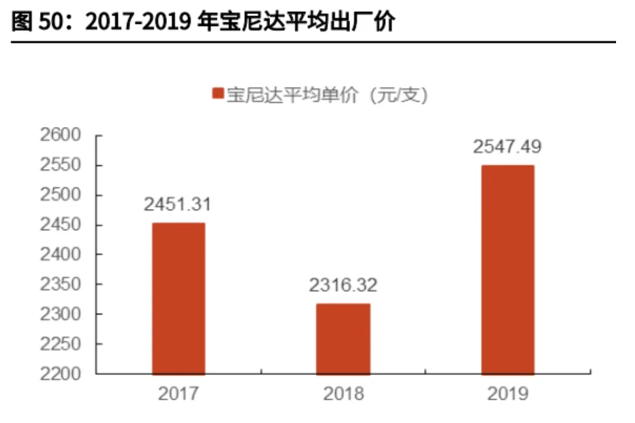 在独特的产品属性与名医技术壁垒的影响下,宝尼达也步入了优质发展阶段。2017-2019年,宝尼达的销量从0.64万支增长至2.65万支,单价从2451.31元/支增长至2547.49元/支,分别实现毛利率98.15%/98.11%/98.73%,分别实现营收0.16/0.34/0.68亿元,CAGR为107%。2021年6月,公司提高宝尼达的零售指导价,从1.28万元/支上升至1.68万元/支,哪怕在零售指导价提价30%以后,市场仍愿意为宝尼达的“安全”溢价买单。