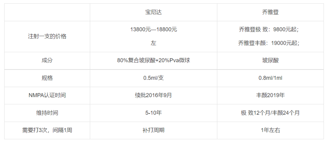 在美商榜排名第四的乔雅登同样属于高端定位,乔雅登丰颜单支价钱19000元起,而宝尼达则是13800元-18800元左右。乔雅登丰颜维持时间则是24个月,补打周期为一年。宝尼达维持时间十年,补打周期频率较高,需要打三次。间隔一周。