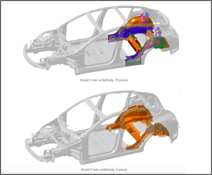 特斯拉Model Y用一体压铸技术来生产车架后底板,原本由70多个零件冲压、焊接而成的Model Y后车架,被一体压铸成型,变成一个超大零部件。生产流程被简化,造车效率被提高。未来,特斯拉的前底板、电池壳等部件,都会用一体化压铸技术来生产。