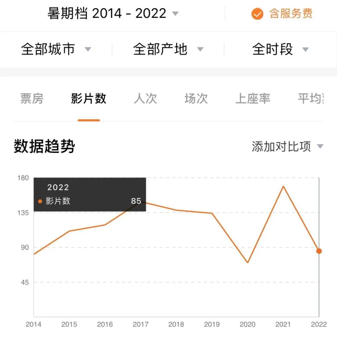 根据灯塔专业版,截至8月4日,定档今年暑期档的影片总数仅有85部,这是除了2020年以外近8年间暑期档上映新片数量最少的一年。