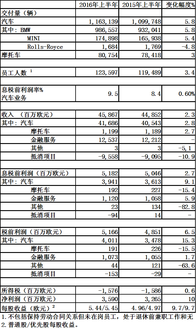 附:宝马集团2016上半年财务与销量数据一览表: