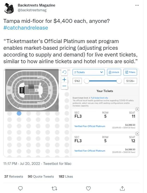简单来说,Ticketmaster为演出提供一个“动态定价”,即算法实时分析平台用户的需求,如果特定位置需求量大,价格就会自动上涨;而对于鲜有问津的座位,价格则会相应地下调。官方的解释称,这种定价逻辑“类似于机票和酒店客房的销售方式。”