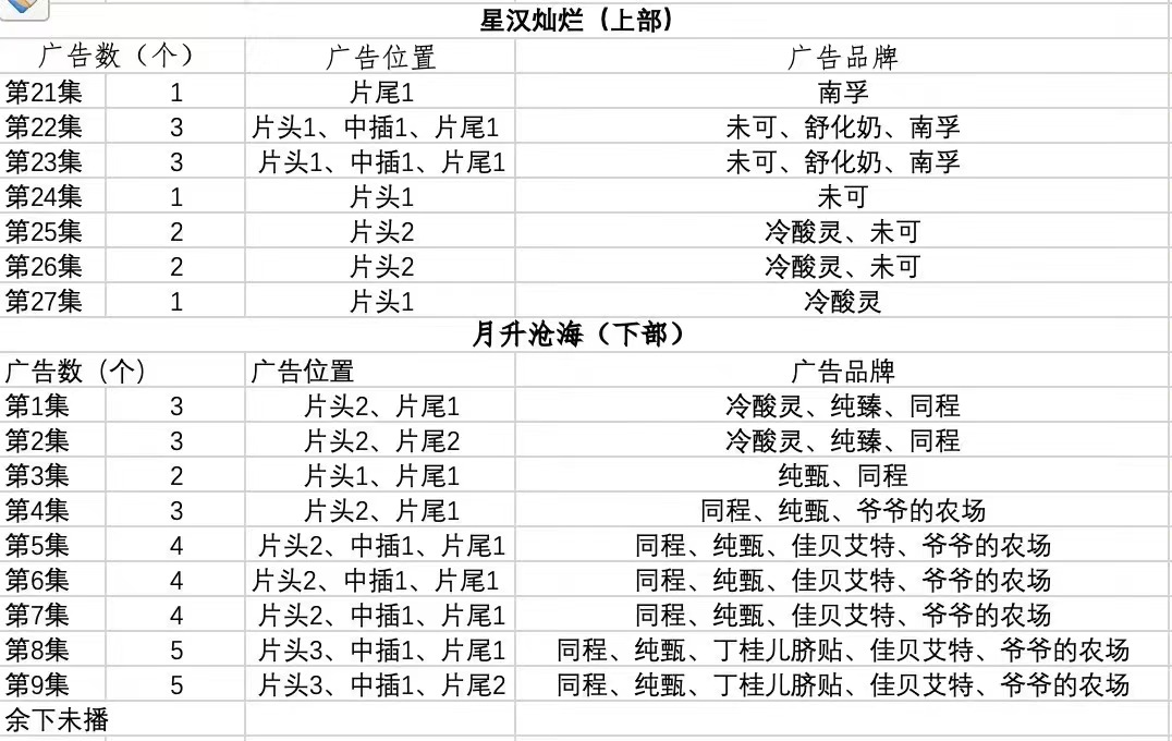 这部剧在开播之前曾因服化道、男女主年龄、同期剧集排播等各方因素,而不被市场和品牌方看好,播出期间“零广告”甚至一度成为大众调侃的话题,可随着剧集口碑发酵、热度发散,第二部《月升沧海》热度显著提高、且突破“零广告”,目前该剧的广告招商已追加至近10个。