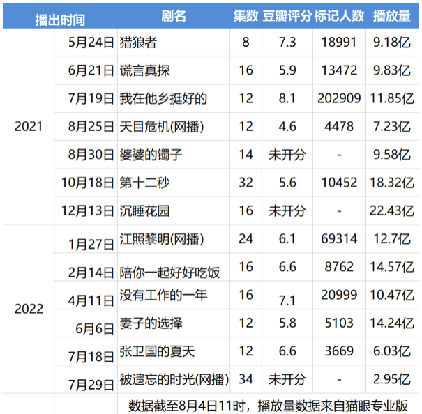 平均集数相对短的“季风剧场”从一开始就更偏向垂类创新、口碑提升、话题突破的方向。“季风剧场”开播以来的剧集如下: