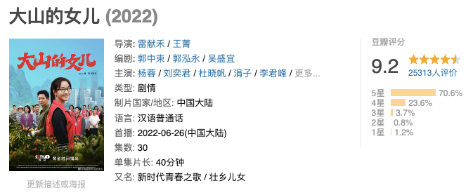 此外值得一提的就是《大山的女儿》了。在2021年的主旋律献礼剧大潮中,口碑达到神剧级别的《觉醒年代》(9.3分)、《山海情》(9.2分)、《功勋》(9.0分)均未能在芒果TV上线播出,错过了主旋律剧历史级别的口碑进阶不可谓不可惜。《大山的女儿》是2022年豆瓣评分最高的国产剧,9.2分比起去年的几部高分献礼剧也并不逊色。对于平台而言,这样的口碑突破有超越播放量高低的价值。