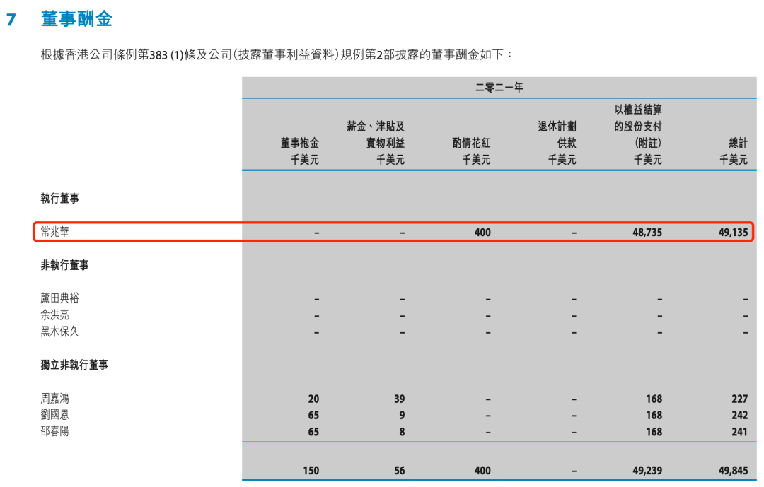 根据年报披露,常兆华酬金已从2020年3655.3万美元(人民币约2.37亿元)上涨至2021年的4913.5万美元(人民币约3.32亿元)。