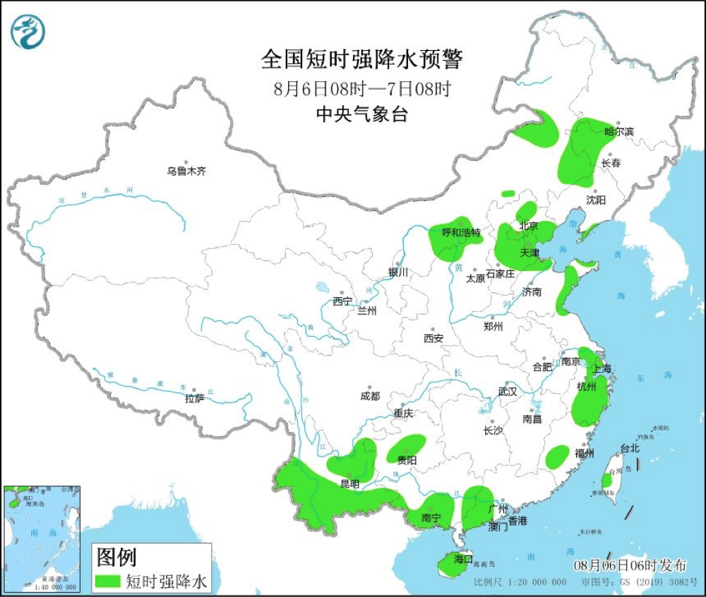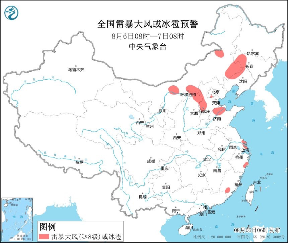 预计8月6日8时至7日8时,内蒙古河套地区和东南部、吉林中西部、辽宁北部、山西北部、河北中部、北京东南部、山东北部、上海、浙江中部、福建东南部等地的部分地区将有8-10级雷暴大风或冰雹天气;内蒙古河套地区和东南部、黑龙江西南部、吉林西部、辽宁北部、陕西北部、山西北部、河北、北京、天津、山东北部和东部、江苏南部、上海、浙江、福建东南部、贵州西北部和中部、云南、广西南部、广东中部和西南部、海南岛等地的部分地区将有短时强降水天气,小时雨量30-50毫米,局地可达80毫米以上。