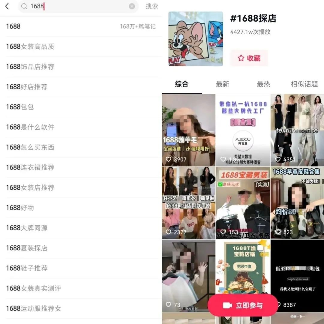 图/小红书1688相关贴(左)抖音1688探店话题(右),来源/燃财经截图