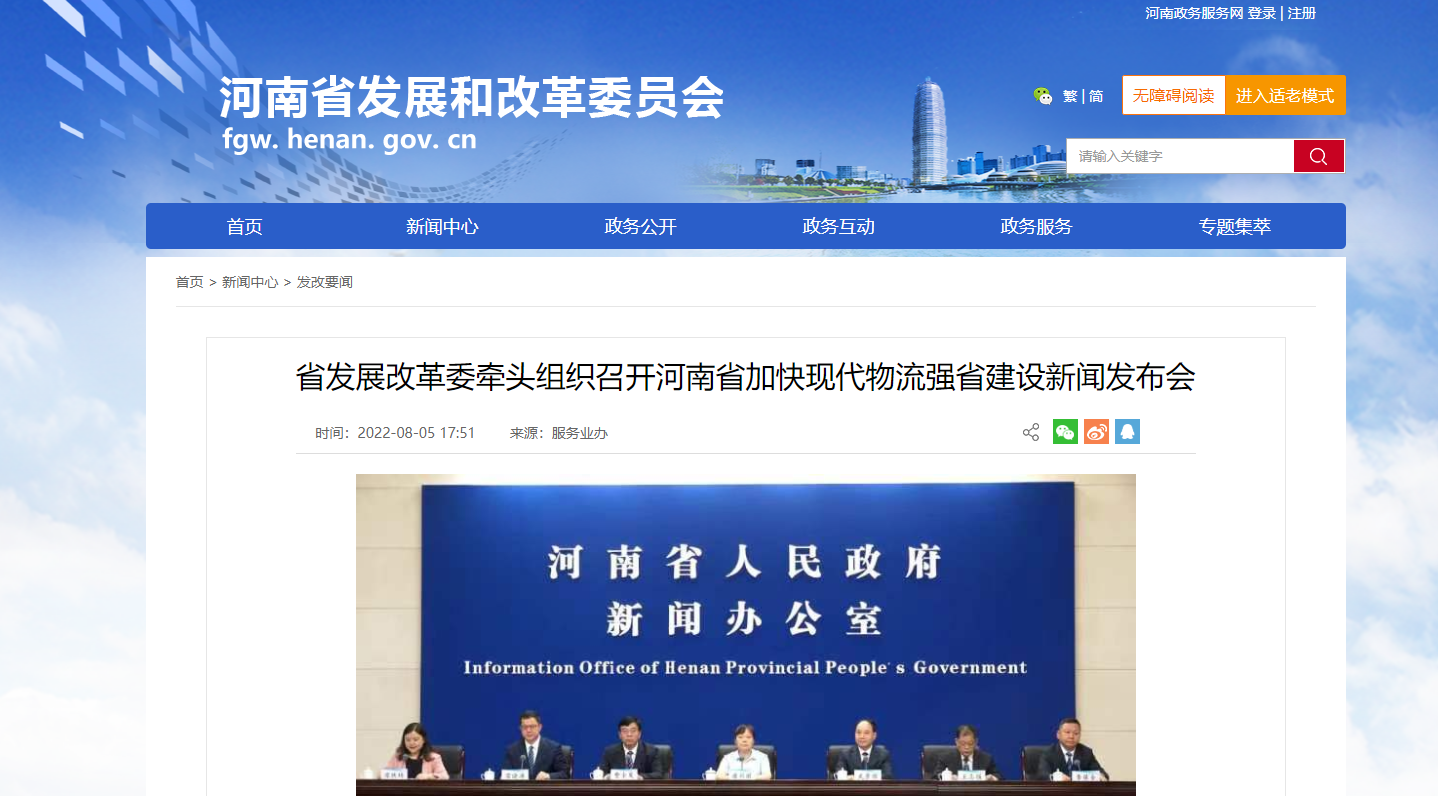 8月6日,界面河南从河南省发展改革委官网获悉,8月5日,省发展改革委牵头组织召开河南省加快现代物流强省建设新闻发布会。省发展改革委党组成员、副主任唐兴丽作为主发布人,介绍了近年来全省物流业发展情况和“十四五”现代物流强省建设的总体考虑,并就物流“豫军”企业培育工作进展情况和下步工作打算做出回答。