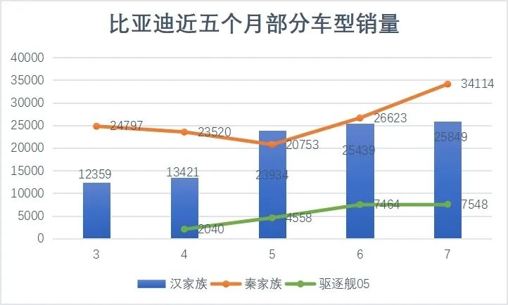 例如比亚迪秦家族7月销量为34114辆,海洋系列同级别车型驱逐舰05销量为7548辆;汉家族7月销量25849辆,而海破豹上市后预售订单轻松便突了6万。单独拿出每一款车型,都有不错的销量数据。