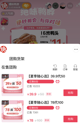 值得注意的是,在绝味抖音直播间售卖的电子券大多数都是39.9元抵50元、78元抵100元等,大幅度的折扣虽然刺激了线下门店的消费,但也在进一步压低产品的收益空间。