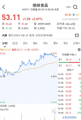 不过,尽管绝味投资触角延伸,加盟店扩张迅速,也没能“拯救”开始缩水的市值。绝味2017年上市时的股价为15.01元/股,巅峰时是去年2月,达到102.27元/股,当时市值超600亿元。而截至8月5日收盘,绝味的股价为53.11元/股,市值为326.42亿元,相比巅峰时期减少了一半左右。