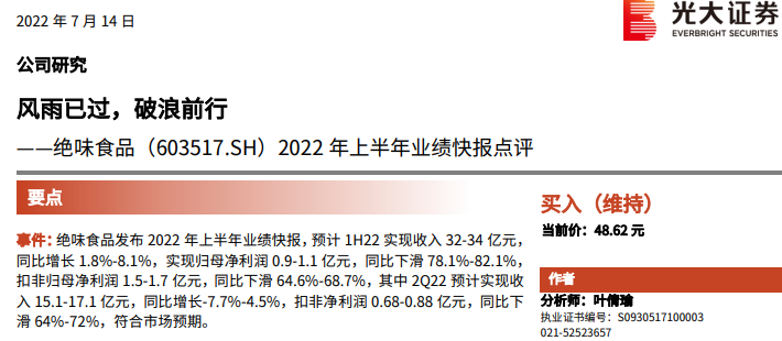 半年预告“成绩单”发布后,安信证券率先发布研究报告。该机构以上半年盈利承压,但因加盟门店生存质量有保证,静待下半年业绩为由,给予绝味“买入”评级。而信达证券也以企业提价缓解成本压力为由,对其持续看好,给予“买入”评级。