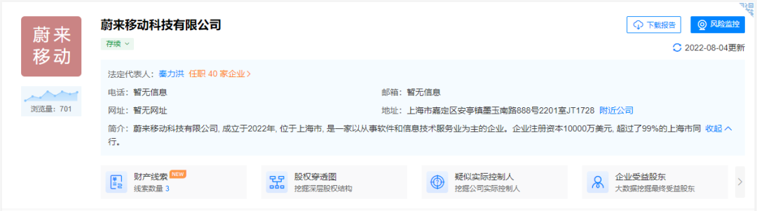 根据天眼查披露的信息显示,2022年8月4日,“蔚来移动科技有限公司”正式成立,注册资本1亿美元,法定代表人为秦力洪。据了解,秦力洪是蔚来汽车的联合创始人,目前在蔚来多家公司担任要职。