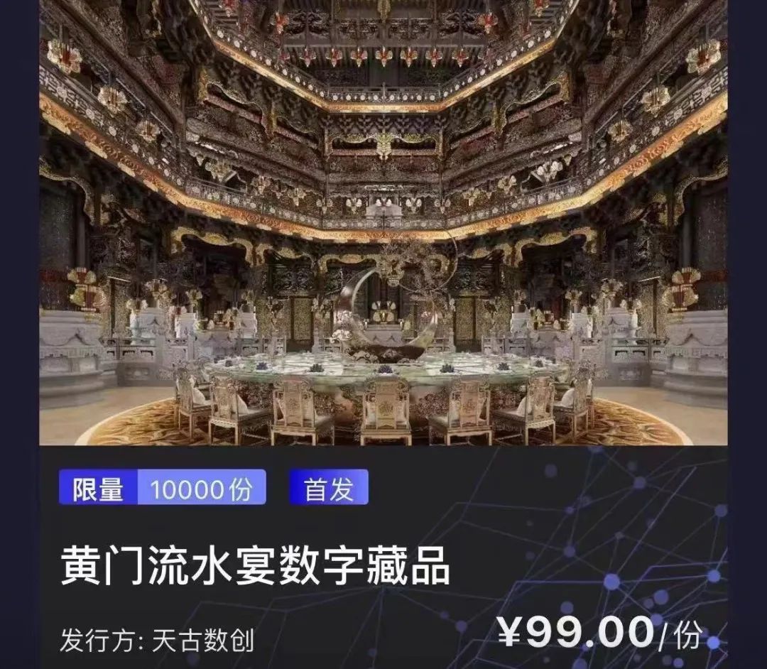 在黄珂刚开始组局的时候,他所居住的望京还被北京人称为新城。多年后,望京已经发展成了北京的重要CBD,新城的说法不再,黄珂也从望京搬去了京郊的别墅,曾经来他家吃席的人变成了黄友会的成员。前段时间,黄友会发布了自己的第一枚数字藏品——灯火辉煌的宴厅中,金黄色的圆桌被摆放在中央的位置,每份售价99元。