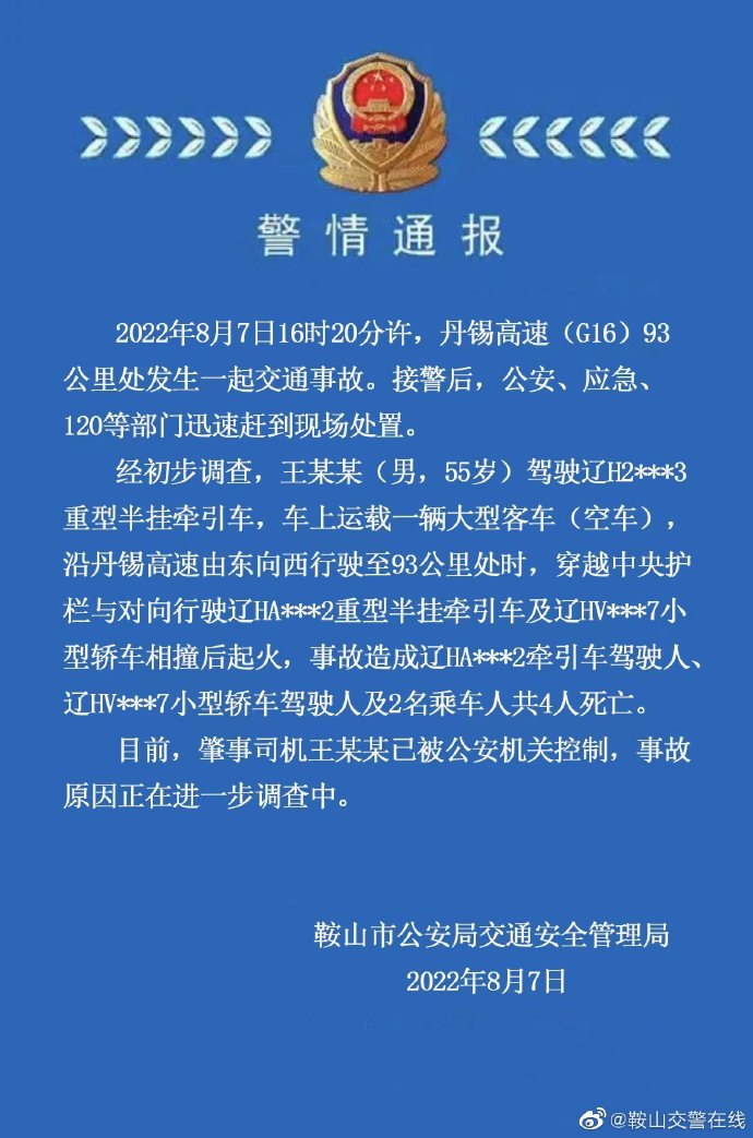 据@鞍山交警在线 微博8月7日通报,8月7日16时20分许,丹锡高速(G16)93公里处发生一起交通事故。