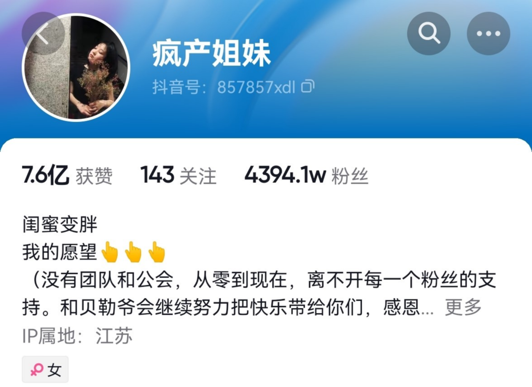 疯产姐妹在账号简介里说明,自己没有团队和工会。对于大流量时代来说,一个没有签约MCN的个人账号,可以做到4000多万粉丝,是相当厉害的。