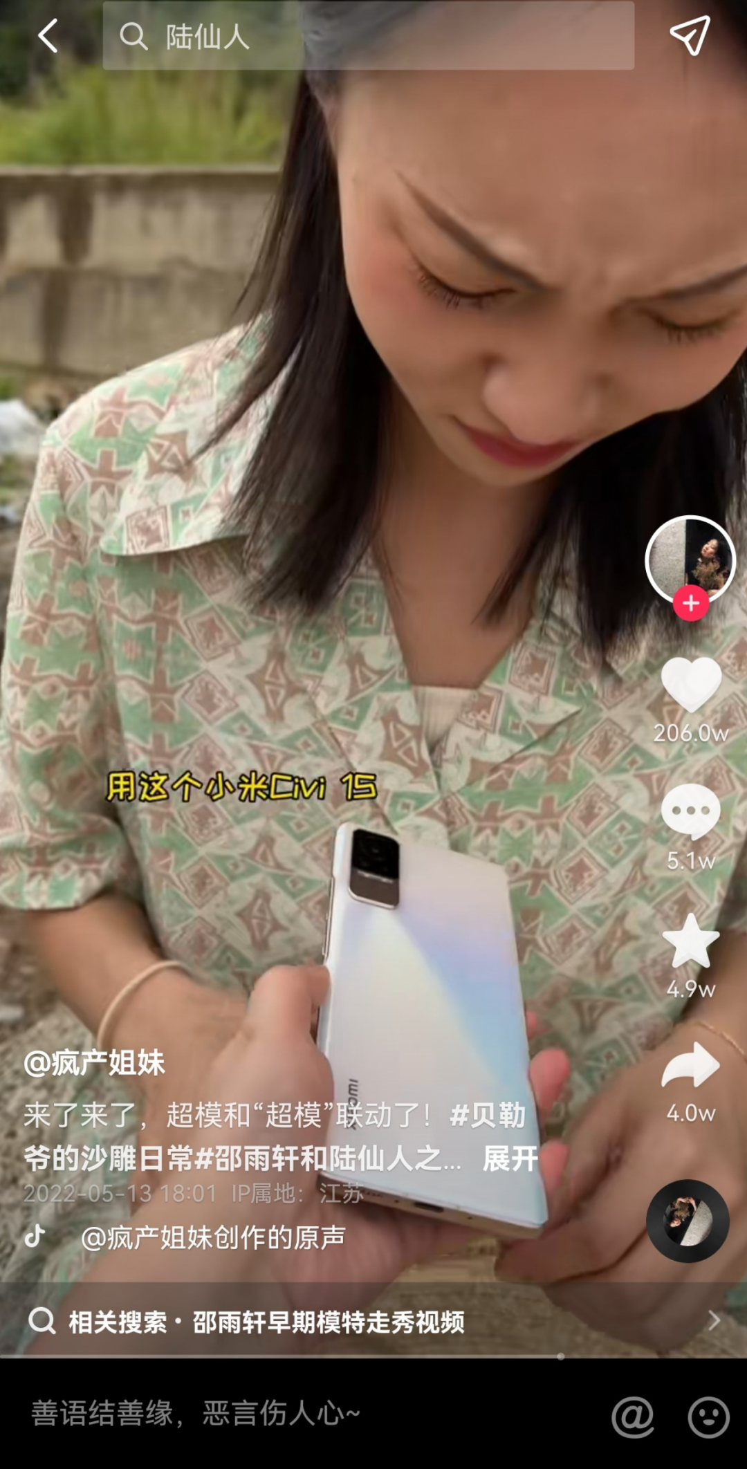 例如在5月13日发布的视频中,疯产姐妹以轻松幽默的拍摄准备过程为前期背景,在视频的后半部分再自然而然地拿出小米civi1s手机,邀请摄影师帮忙拍几张照,最后展示手机拍摄的成片。这样的方式既不破坏原有的搞笑气氛和视频风格,也起到了很好广告宣传的效果。