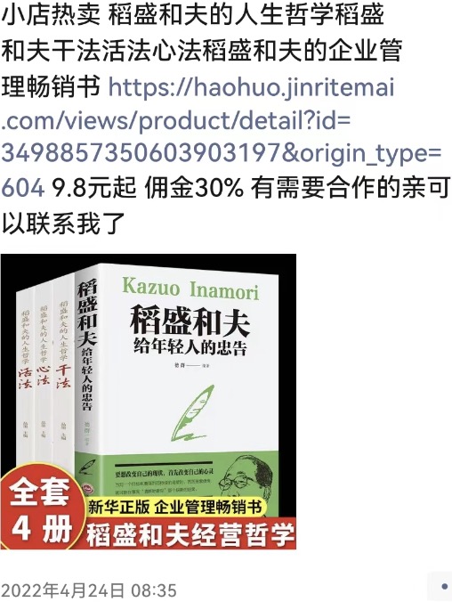 界面文化找到某短视频直播平台一家出售《稻盛和夫给年轻人的忠告》的书店,连带着一起售卖的还有《稻盛和夫的人生哲学:活法》《稻盛和夫的人生哲学:心法》《稻盛和夫的人生哲学:干法》三本图书。这些书的作者是中国人,内容是对稻盛和夫著作的感想。市面上正版的《干法》是机械工业出版社出版的,《心法》《活法》是东方出版社出版的,作者均为稻盛和夫本人。