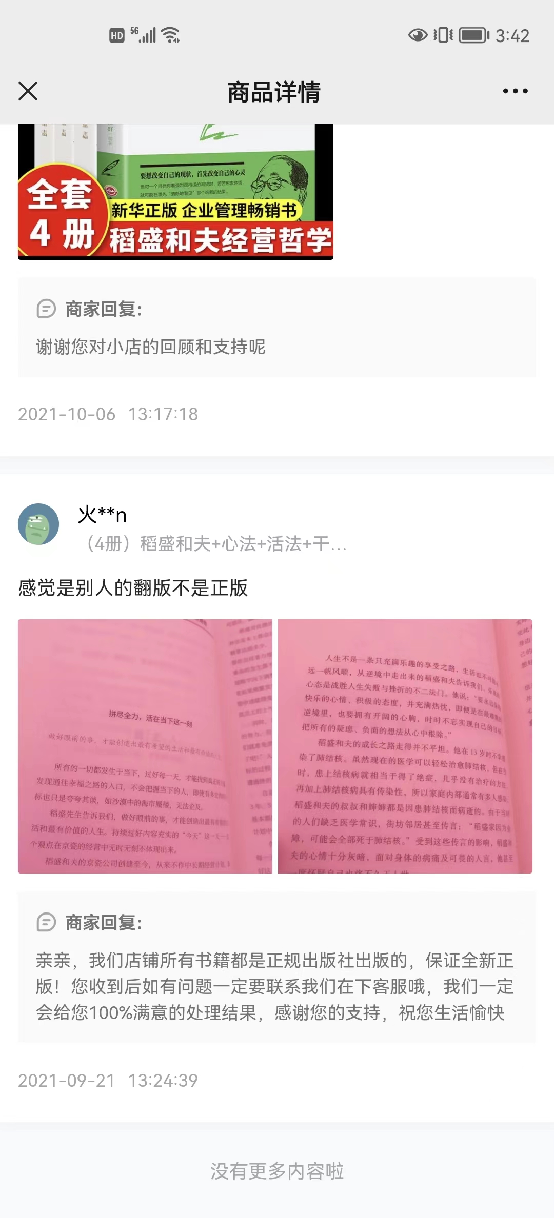 书籍购买的评价中有“材质一般”、“感觉是别人的翻版不是正版”,“其实价钱对得起内容了,就是希望卖家提前说好这是作者观后感,并不是正版稻盛和夫先生写的,我后来又从别处买了一套正版”等文字。而客服在这些评论后注明:这些书是百分百正版。界面文化在这些图书的详情页里看到了有标注的书号,但不确定书号的真假,不过即便这些书有正式的书号,却依然有挂羊头卖狗肉的嫌疑,可谓是游走在法律灰色地带。