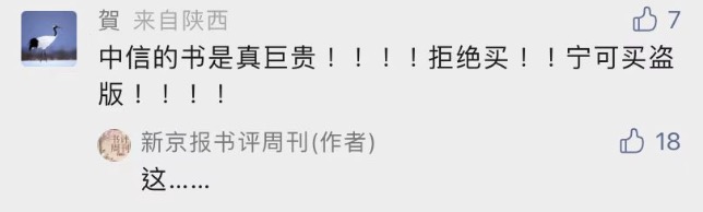 有趣的是,8月7日,新京报书评周刊发表了一篇《从“接近问题”到“接近读者”:中国本土经济学的畅销之路》,内容谈的是中国的经济学畅销书,其中一位读者留言道:“中信的书是真巨贵!!!!拒绝买!!宁可买盗版书!!!!”这或许反映了一部分消费者的心声。