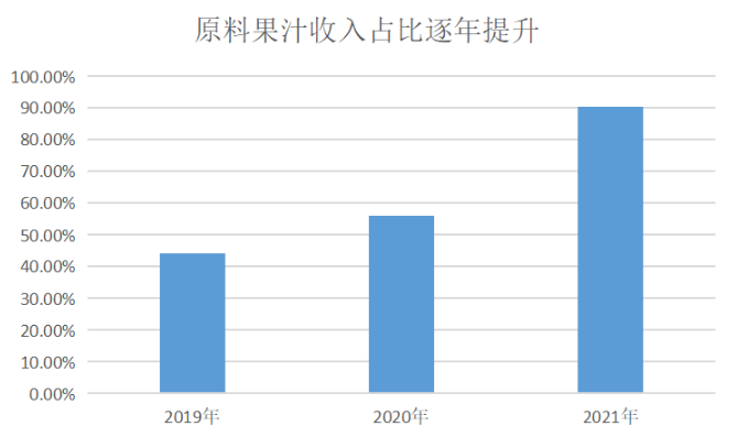 新茶饮品牌盈利压力之下,田野股份所在的新茶饮原料果汁供应链环节,很难说不会被替代。要知道,原料果汁是田野股份最抗打的业务,其营收占比已经从2019年的44.13%提高至2021年的90.52%,一旦不再被需要,将十分致命。