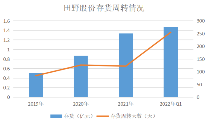 2019年~2021年,田野股份的存货账面价值分别为5059万元、8686万元和1.34亿元,占总资产的比例分别为5%、9%和11%,金额不仅大还呈现逐年增长态势。根据Wind数据,其存货周转天数已经从2019年的84.75天,增至2021年的122.28天,2022年一季度的255.32天。
