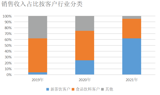 数据显示,田野股份来自食品饮料客户的销售收入占比已经从2019年的57.66%降至2021年的33.49%,来自新茶饮客户的销售收入占比则从2019年的4.2%上升到61.82%。