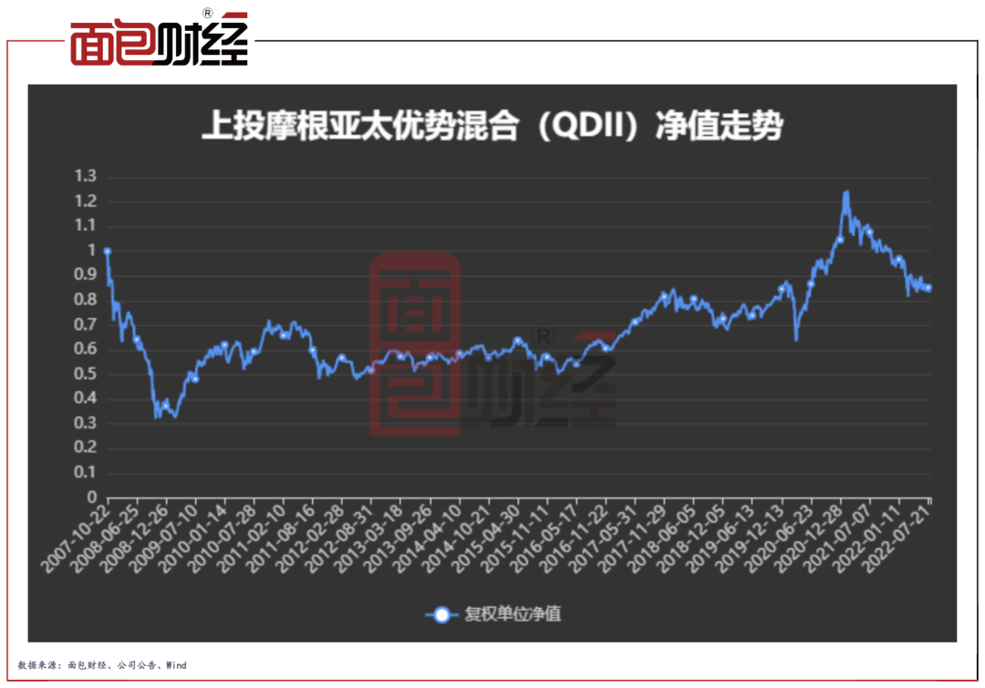 作为首只提出以亚太市场为投资目标区域的股票型投资基金,上投摩根亚太优势混合(QDII)曾创下首日认购规模突破千亿元的历史记录。基金最终配售比为25.8%,有效净认购金额约295.69亿元。但截至2022年6月末,上投摩根亚太优势混合(QDII)以101.51亿元的累计亏损成为四只首批出海的基金系QDII中的“垫底”产品。