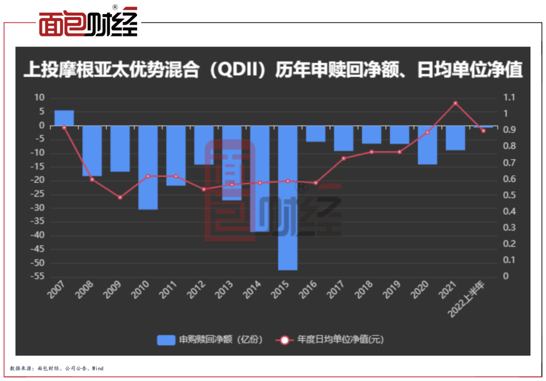 数据显示,上投摩根亚太优势混合(QDII)从2008年开始持续遭遇净赎回。其中,2010年、2014年、2015年为赎回高峰期,分别净赎回30.46亿份、38.57亿份以及52.51亿份。