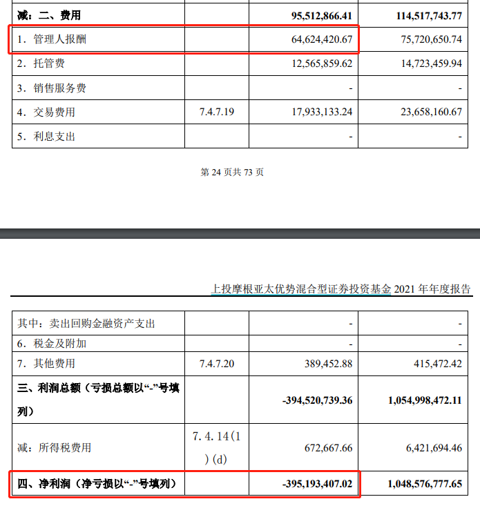 尽管产品长期业绩表现不佳,上投摩根基金每年仍然能够收到相当金额的管理费。年报显示,2021年上投摩根基金作为基金管理人从该产品获得的报酬约6462.44万元。根据费率计算,2022年也仍获得数千万元管理费。