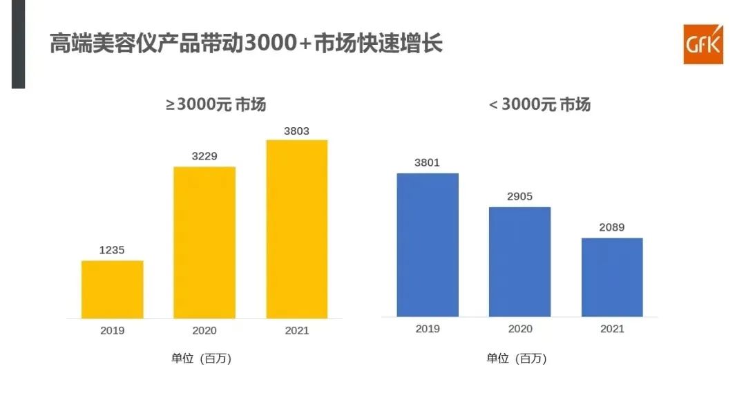 根据《GfK2021年电子美容仪市场总结》的数据显示,电子美容仪市场结构在过去3年中发生了巨大的变化,拥有“医美”效果的高端美容仪产品带动了3000+价格段市场的快速增长。2021年,3000元以上价格段的市场销售额超过38亿元,较2020年有17.8%的增长。相反,3000元以下的美容仪市场份额在过去几年中呈持续下降的趋势。