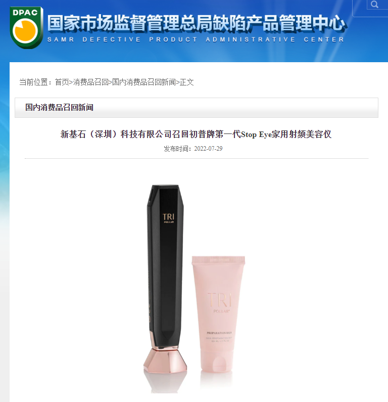公告显示,本次召回的初普一代家用射频美容仪,如果在使用过程中长时间停留在同一位置或过于缓慢移动时,可能出现设备探头温度过高的现象,极端情况下存在导致皮肤烫伤的安全隐患。